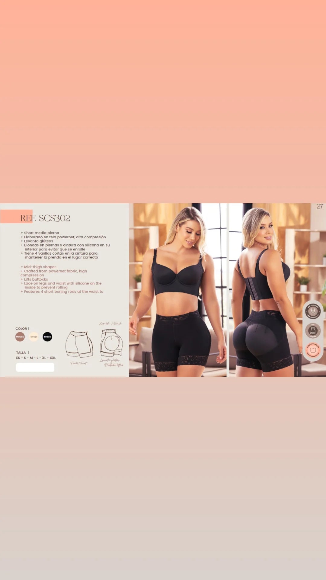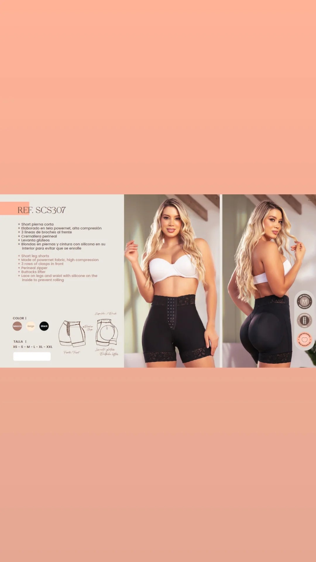 • Reducción de dos tallas en cintura para destacar tus glúteos de mayor volumen.